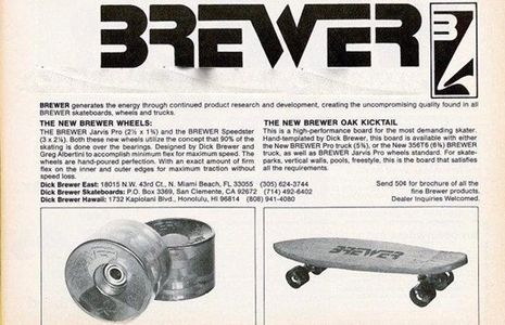 Following the introduction of the polyurethane skateboard wheel, Brewer Skateboards is launched in 76. Team riders at that time included owner Greg Albertini, Bud Lamas and Scott Williams. Unique to any other skateboard manufacturer was the fact that the trucks and wheels were made in house. Dick Brewer's father, Charles Brewer, owned and ran a tool and dye shop in Bellflower Calif. and as a result designed and manufactured the trucks. It was Dick's brother Charles ll who created the polyurethane wheels. Dick's nephews Michael and Chuck were also involved in the production. It wasn't about just slapping a logo on a product, this was genuinely a passionate family operation. Also created in this setting were Brewer fin boxes and leash plugs as well as the Lexan Brewer fin.