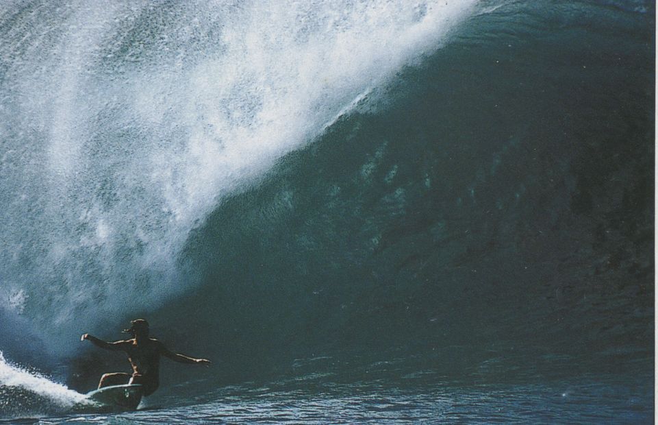 In 1985 Steve Morgan and Gary Linden dissolve their partnership with Linden taking back ownership of the factory and Morgan taking control of the Dick Brewer Surfboard label. Brewer and Morgan become partners in which Morgan opens up the pathway for Brewer to take back complete control of his name and trademark. That same year Alex Cooke does his famous drop into outside Pipeline via helicopter. The event is filmed by Warren Bolster, and as a sideline, creates the best selling postcard ever in Hawaii entitled “The Biggest Wave”. Derrick Doerner and Alex Cooke make exceptional showings at the Eddie that year.