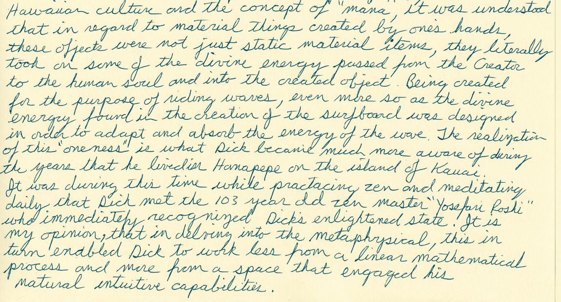 Going back almost forty years, I am grateful to Gary Linden who at that time opened the door and convinced Greg Albertini to bring me on board as a shaper for Dick Brewer Surfboards. For most of the next decade I worked closely with Dick Brewer and from morning to night, Dick Brewer Surfboards was that in which my entire life centered around. And while this included extraordinary events and moments of significant discovery, like any endeavor, it also included the daily grind and ordinary ritual, those things that can deceive us and cause us to take our circumstances for granted. Looking back in history though, I realize, that at a young age I had won the shaping lottery. While most shapers just wanted a brief connection with Dick Brewer, for me this connection encompassed a significant portion of my life.